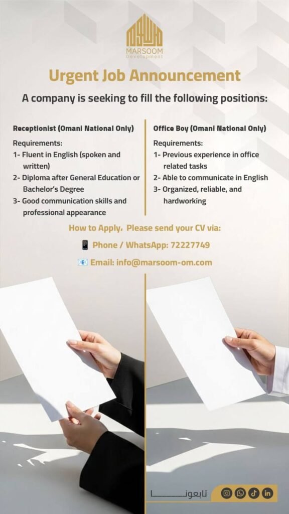 شركة مرسوم للتطوير العقاري في مسقط – فرص وظيفية ( موظف استقبال + Office Boy )