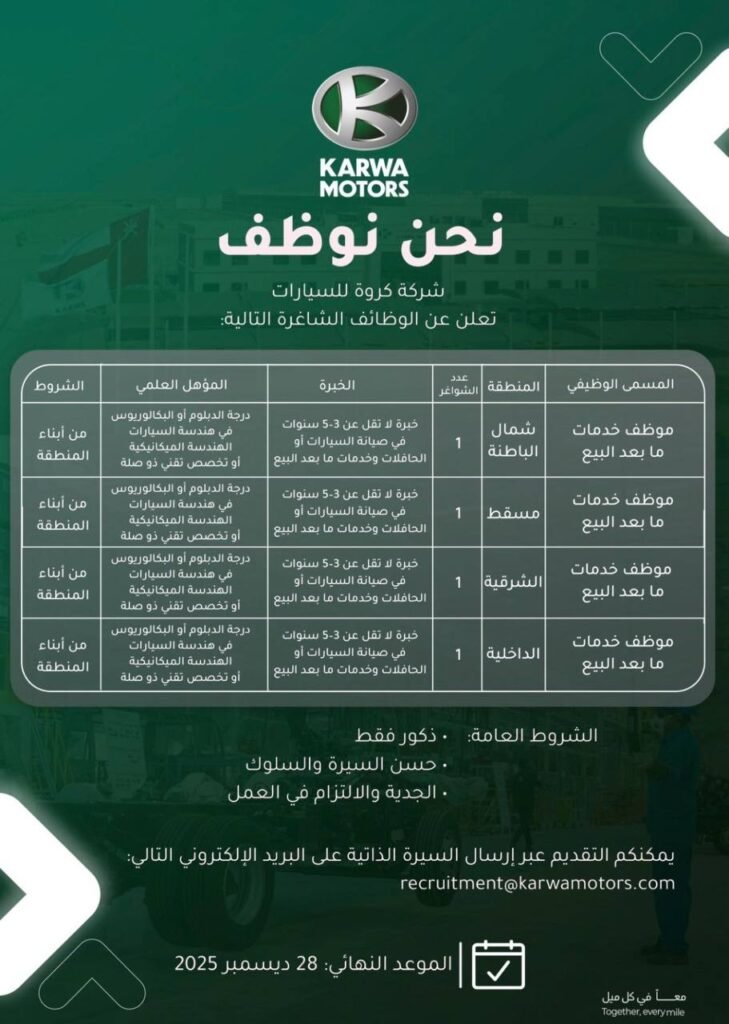وظيفة عامل ميكانيكي قطع غيار في الظاهرة – سلطنة عمان