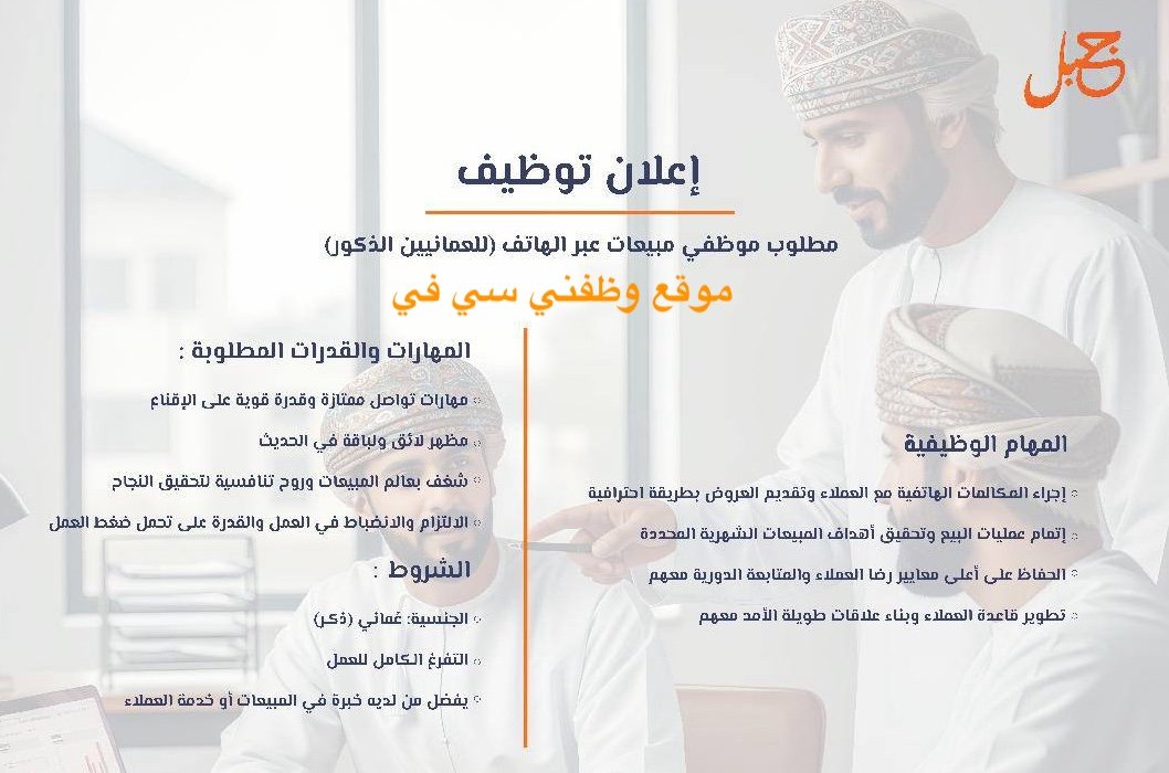 تعلن شركة “جبل” عن توفر وظائف كول سنتر في قسم المبيعات، حيث تبحث عن موظفي مبيعات عبر الهاتف خبرة وبدون خبرة وتعتبر هذه فرصة ممتازة للشباب العماني الطموح الذي يمتلك شغفاً بعالم المبيعات للانضمام إلى فريق عمل تنافسي برواتب متوقعة تتراوح من ٣٥٠ الي ٥٠٠ ريال (غير مذكورة بالاعلان) وونشر التفاصيل ورابط التقديم.